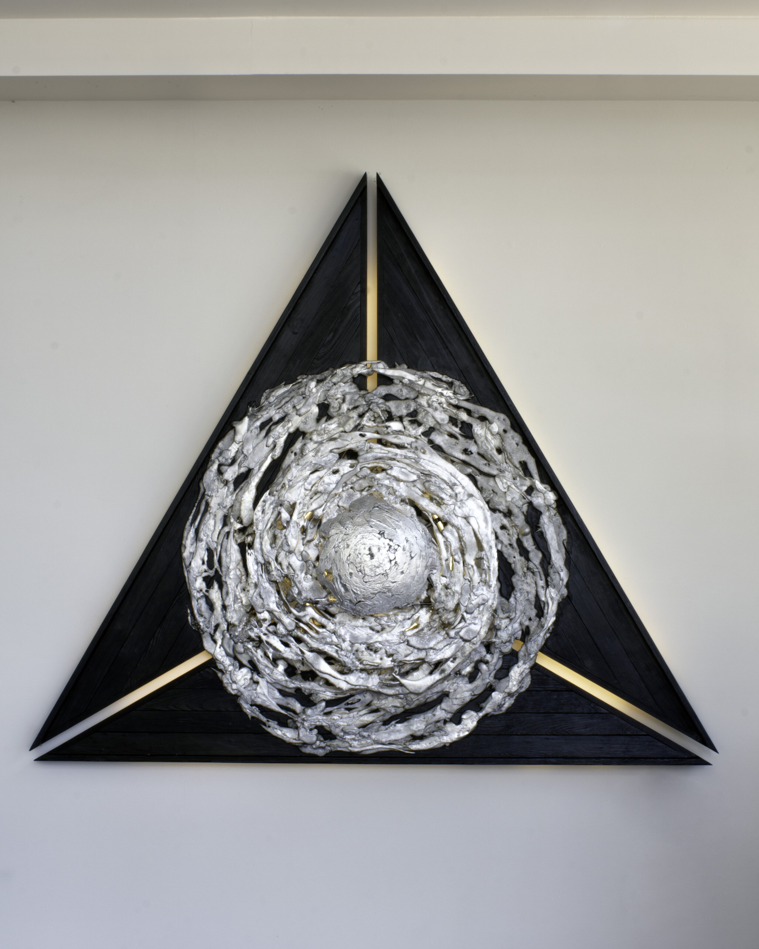 Hand-sculpted concrete, steel, light