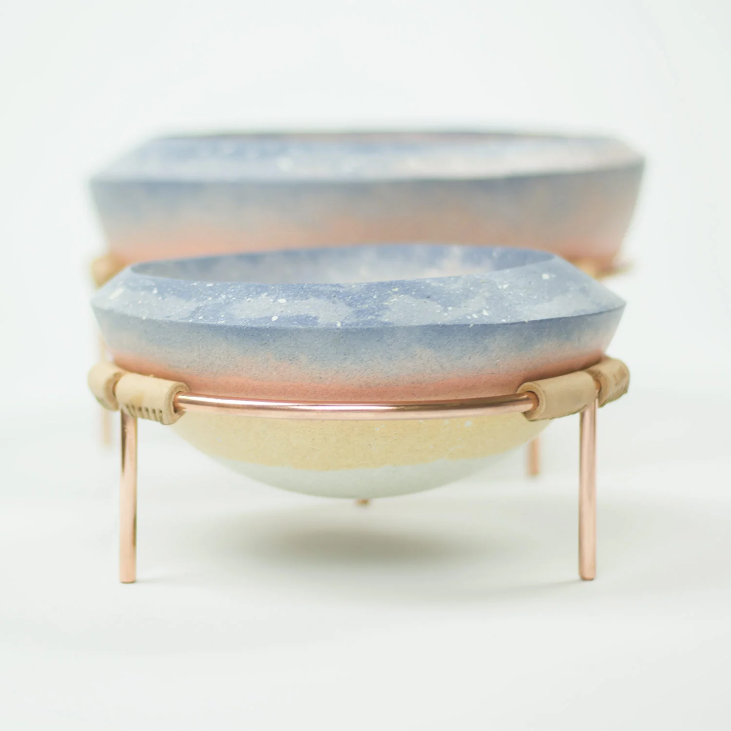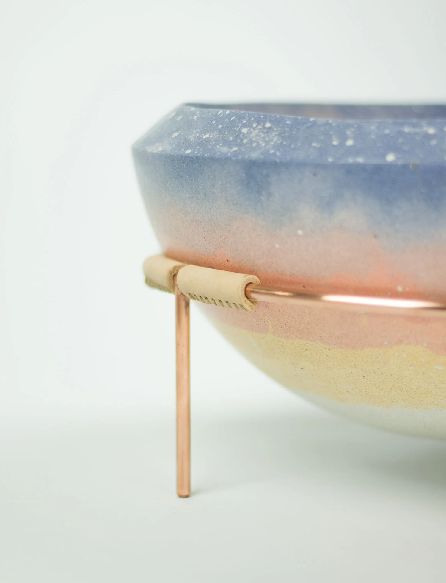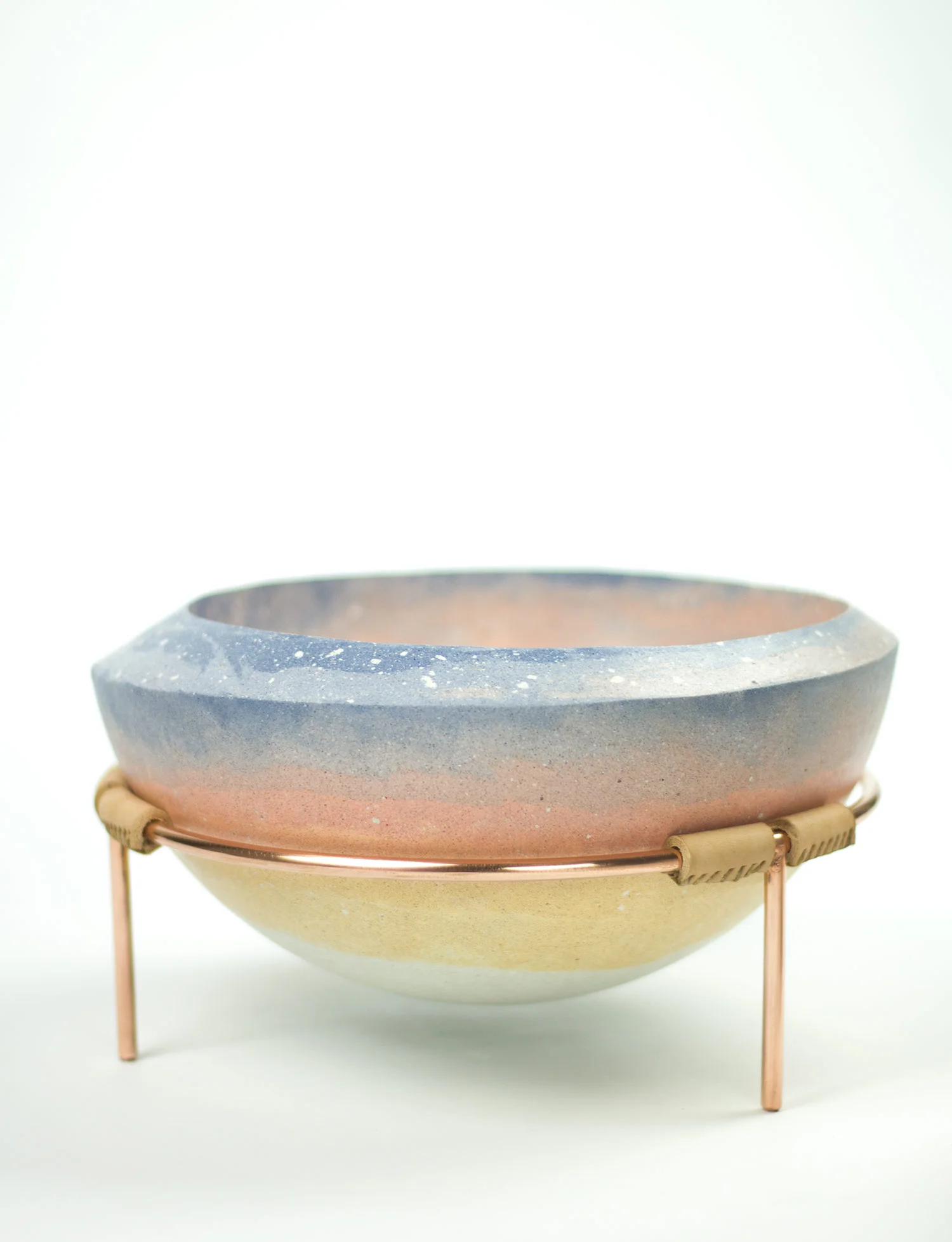 The Sun can't set unless it rises. The Lunah Sunrise incorporates the same techniques as the Sunsets but in different order and slightly lighter pigments. Solid copper base with hand-stitched natural leather accents. Available in 8", 10" and 12" diameters. Custom sizes are also available upon request.